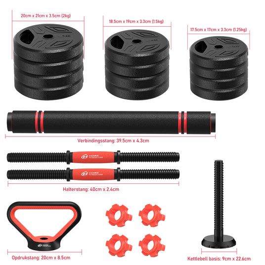 - Inhoud Verpakking: 2KG Gewichtsplaten x4; 1,5KG Gewichtsplaten x4; 1,25KG Gewichtsplaten x4; Halterstang x2; Trekstang x1; Push-up stangen x2; Kettlebell basis x1; Gewichtsmoeren x4