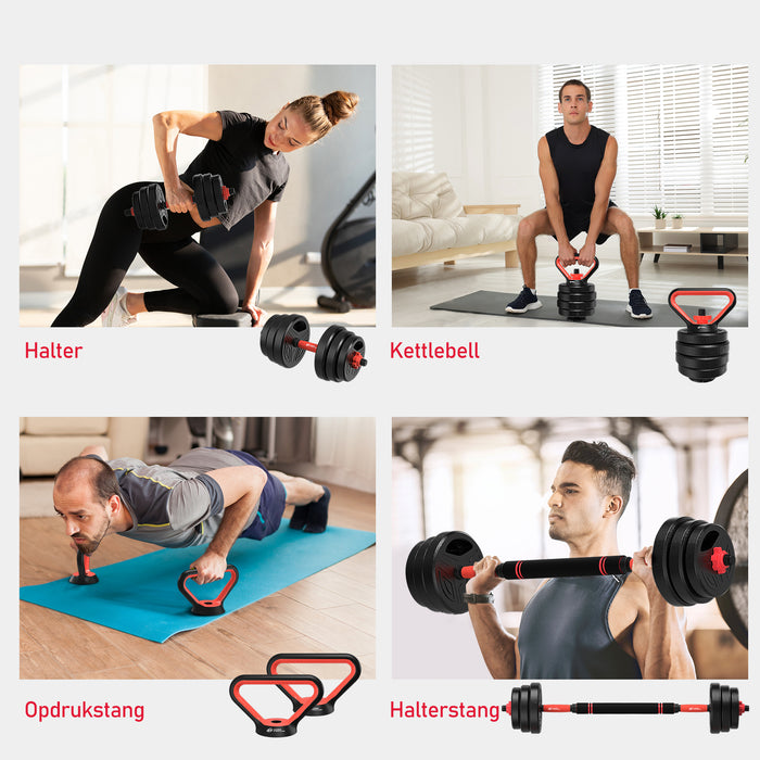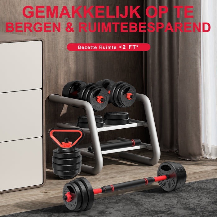 Gratis combinatie betekent dat je dumbbells, kettlebells, barbells en push-up standaarden in één set hebt!