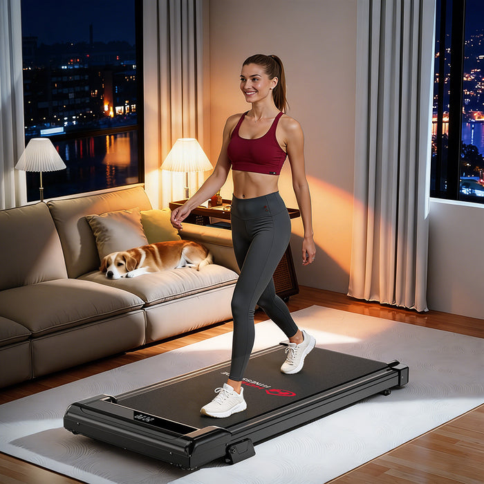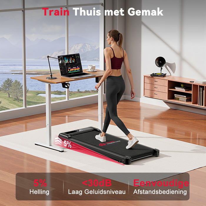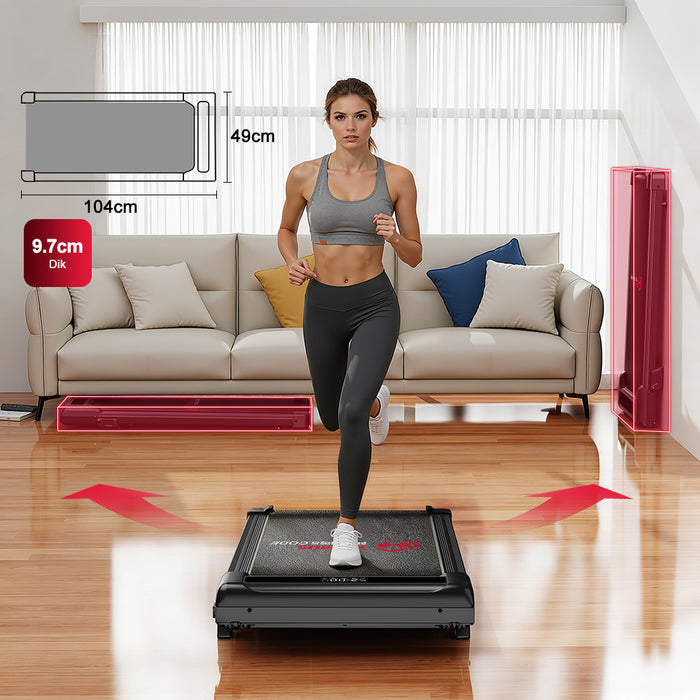 Het compacte ontwerp past gemakkelijk in kleinere ruimtes. Je kunt de loopband eenvoudig onder een bank of bed opbergen of tegen een muur plaatsen wanneer je hem niet gebruikt.
