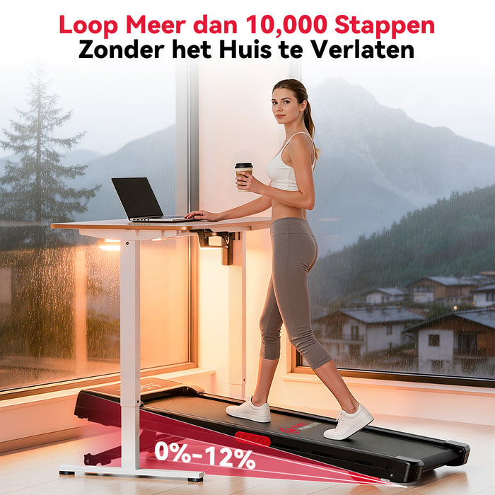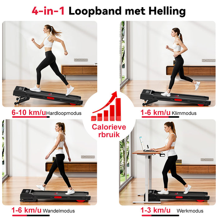 Deze veelzijdige 4-in-1 loopband met een snelheidsbereik van 1-10 km/u is ontworpen voor werken, wandelen, klimmen en hardlopen.